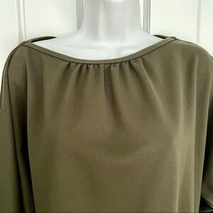 Trina Turk, small boatneck,elastic drop waist, billowy 2/4 sleeve,mini length. In very good pre owned condition.