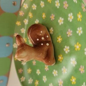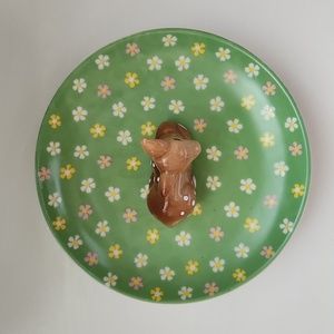 Cute little trinket dish with a sweet fawn in the middle. 5 inches in diameter so perfect for rings or anything small. No chips.