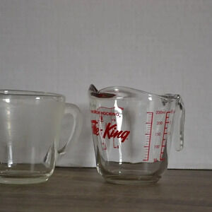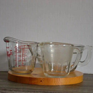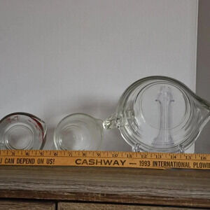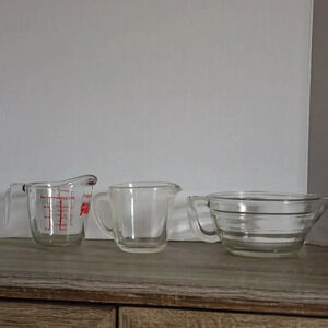Three glass vintage measuring cups/ mixing bowl.