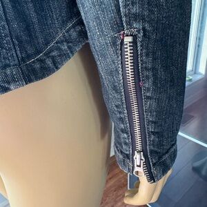 Stylish black denim jacket. Features pink zipper pocket. Unique button and chain details. Perfect for casual wear.