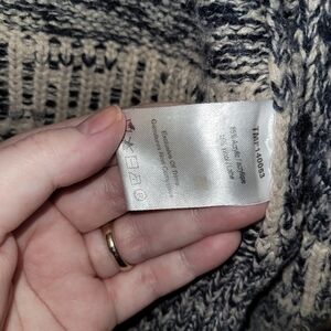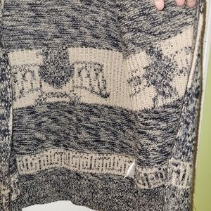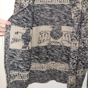 Blue/Cream colours. Thunderbird and Greek key patterns. Full Zip. Mock neck. 15% wool.