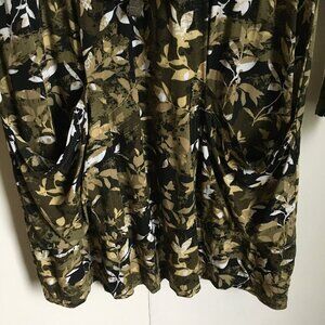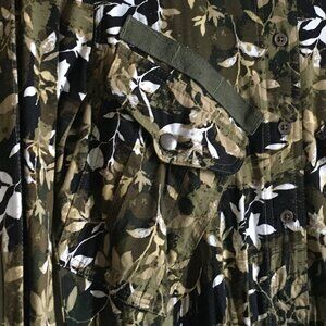 Excellent preowned condition long, floral camo dress with button closure on the upper toroso and tie waist by Triple Five Soul NYC. Plenty of pockets! This dress has two upper pockets with canvas accents, snap closures and two loose lower pockets. Green patches are featured on the eblows of each sleeve. Worn once or twice.