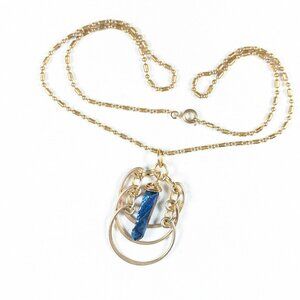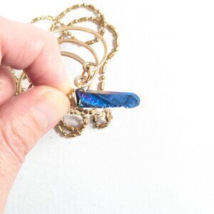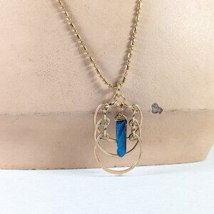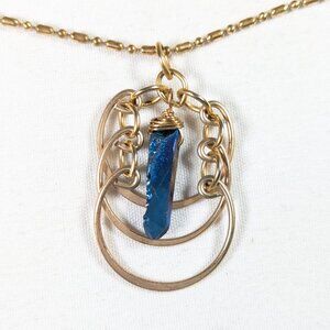 A handmade (custom?) pendant, perfect for Wiccans Witches and Warlocks doing crystal work. The piece features a gold tone wire wrapped piece of Rainbow quartz, backed by 3 crescent moon shapes. The piece comes with a matching chain.