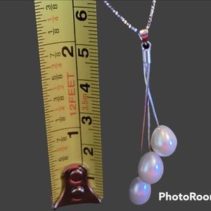 925 silver and white triple pearl necklace. Measurements, 16” silver chain + 3” white pearl pendant.