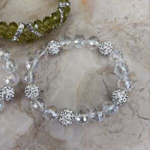 Beautiful set of 3 crystal beaded stretch bracelets, two are matching, clear multi faceted crystals and “diamond” encrusted beads in lovely silver. The third bracelet is made of pretty green crystals with a “diamond” pattern all around.