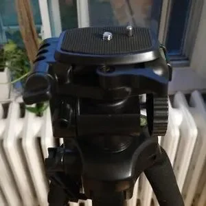 6' Tripod with leveler, weighted hook, and case (with strap). Deep discount for the plate handle snapped and has been replaced with simple screw. 26" Compact size.