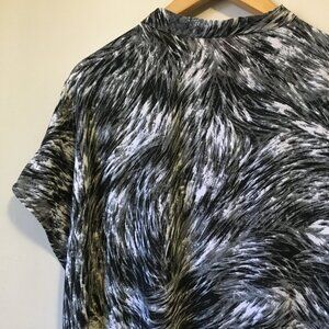 Very good preowned condition, almost sleeveless/muscle/cap sleeve shirt with faux hidden button up closure and buttoned banded collar, in chiffon by Joe Fresh. Features an overall monochrome (black, white and grey) print of swirls, almost like swirled hair. Some of the pictures looks blurry, but it's just the pattern. Completely trippy and adventurous. The collar is my favourite part of this shirt. Some of the paint on the metal button has been rubbed off. It could either be repainted on or removed.