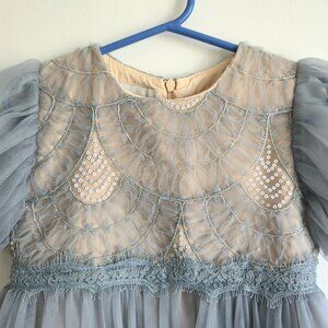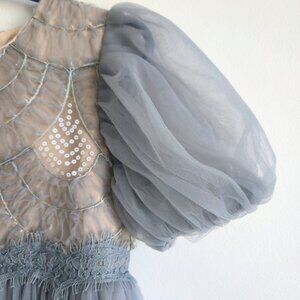 Trish Scully Child Dusty Blue Sequin Tulle Dress With Puff Sleeves | Size 5