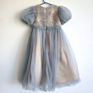 A truly magical and eye-catching formal dress from Trish Scully Child! This gorgeous gown is perfect for special occasions where your little one wants to make a sophisticated statement. This dress has a dusty blue/grey tulle overlay on a nude/tan lining, creating a beautiful depth of colour. The bodice showcases a spectacular Art Deco inspired pattern with pearlized accents, providing a subtle shimmer. The dress has an empire waist detailed with matching lace trim, and dramatic puffy tulle short sleeves.