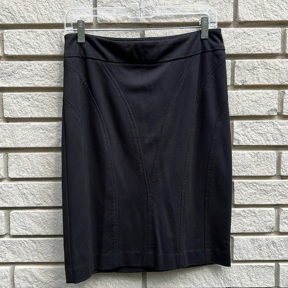 Pull on skirt. Black with sewn curving v detailing on front and back. Great feeling material, soft with lots of stretch. Fitted skirt.