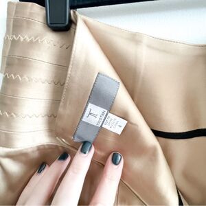 Tristan Gold Satin Party Skirt, Crossover Belt, Stretchy, Lined, Back Zip, Women's 8. Pencil skirt. Back vent 5". Very good used condition. Please see photos for approximate measurements.