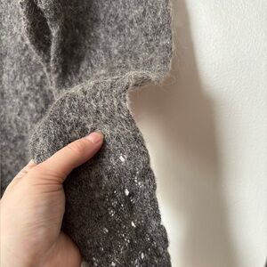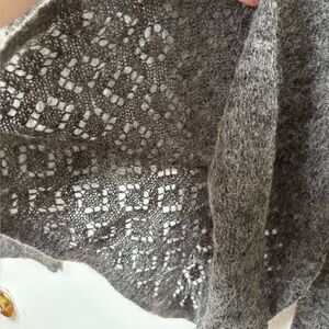 Grey mohair-acrylic blend knit sweater with lace cutout detailing at shoulders and sleeves. Soft, slightly fuzzy texture. PTP: 20" | Length: 25"