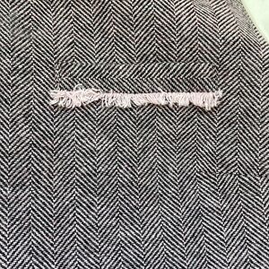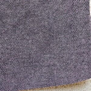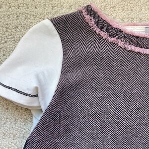 This super cute t-shirt features a wool blend front with chest pocket and ruffle around the neck in a pink and black herringbone pattern. White back. It is in pristine like new condition with no holes or stains. Made in Canada! Laying flat unstretched, size XS measures: