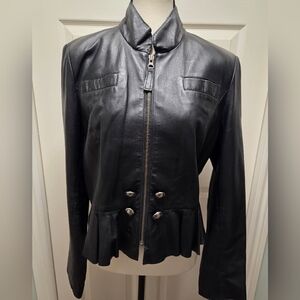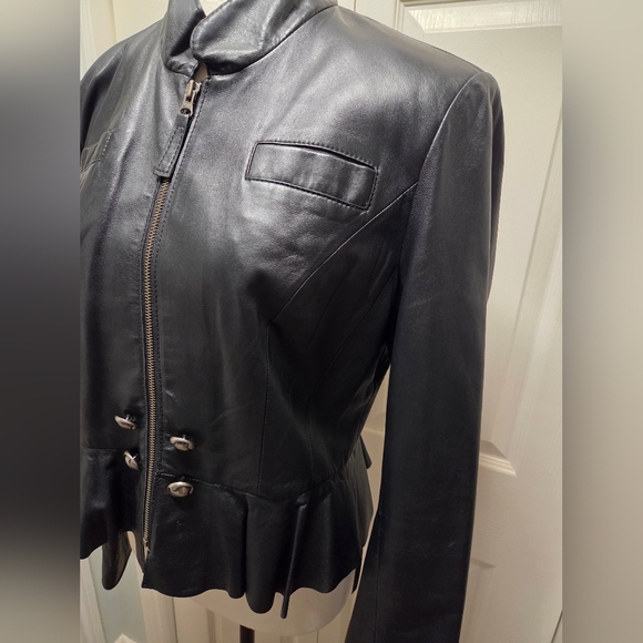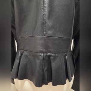 Sleek and stylish black leather jacket for women. Awesome ruffle bottom design. Perfect for adding a touch of oomph! soft leather. bottom 2 decorative buttons missing - last photo.