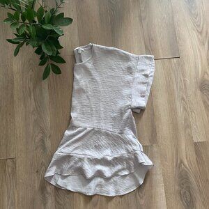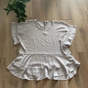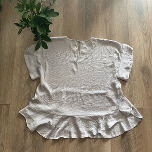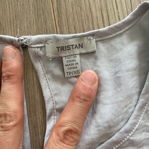 Tristan Slate Gray Flowy Short-Sleeve Blouse with Button-Neck Closure. In excellent condition with no visible flaws or defects (tears, stains, damage, pilling). Great for work or casual wear with jeans. Awesome closet staple & perfect for spring!