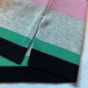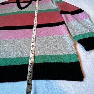 Tristan Sweater, multi-colour striped peach, pink, light grey, green with black trim V-neck. It's over-sized for small to medium. Please check photos for understanding of sizing. Made of 54% polyester, 20% nylon, 20% acrylic and 6% wool