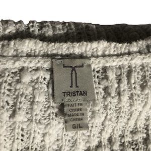 Picturing the white V-neck sleeveless pullover sweater from Tristan in size large tunic length with one front pocket and bouclé knit