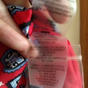 color is not quite red, leans towards hot pink with blue black and white geometric abstract print pattern
