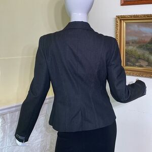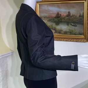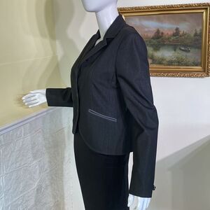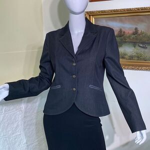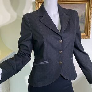 In excellent preowned condition beautiful and stylish short fitted blazer jacket from Tristan. Single breasted with 3 button closure, rounded edges and contrasting details at the hip pockets and cuffs. A feminine design on a classic piece that will go with tons of stuff in your wardrobe.