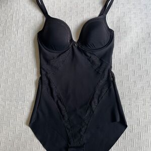 NWOT - Black shape-wear/lingerie form fitting bodysuit with flattering lace inserts. Size small. Molded cups and adjustable straps for shoulders. Cotton gusset with 2 sets of hooks for perfect fit.