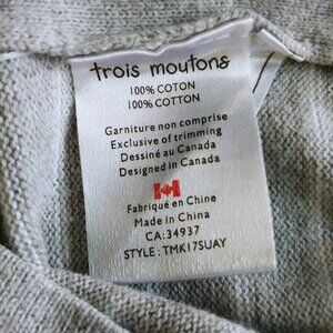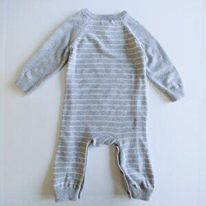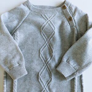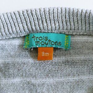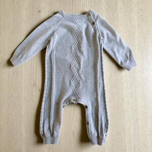 The gray romper by Trois Moutons features long sleeves with ribbed cuffs at the wrists and ankles. It has buttons along the left shoulder and down the inner legs. The front of the onesie showcases a decorative diamond pattern knitted into the fabric, while the back has stripes. The romper is in very good condition, with no stains or holes, and is in size 9 months.