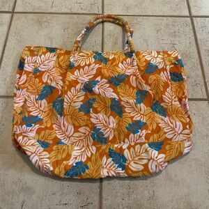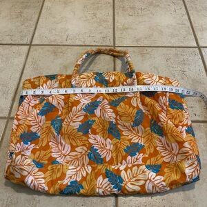 Carry your essentials in style with this vibrant tropical-themed tote bag. Perfect for a beach day, shopping trip, or as a chic carry-all for daily use. The bag features a beautiful floral print in shades of orange, blue, and yellow. It has sturdy double handles and a spacious interior to hold everything you need. This tote is in great condition and ready for its next adventure!