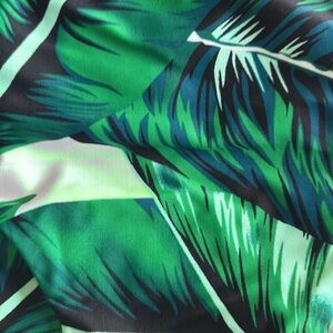 Stylish bikini set with a vibrant tropical leaf print. Features a racerback top and strappy bottoms. Excellent condition