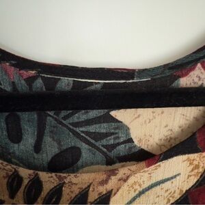 This unique vintage-inspired midi dress features a bold tropical leaf print in deep red, teal, black, and tan tones. Designed with a scoop neckline, short sleeves, and a flattering lace-up back detail that adds shape and charm. The lightweight, ribbed-texture fabric makes it perfect for warm-weather styling or layering in cooler seasons.