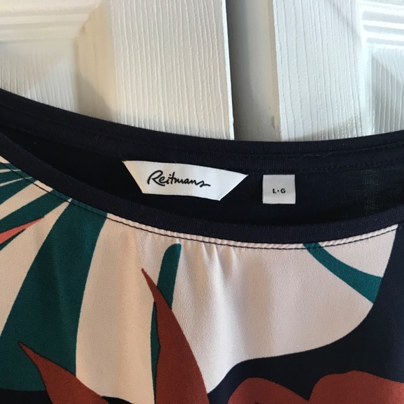 Mixed media top. Front is 100% polyester and has leaf pattern in green, coral, navy, cream and copper. It has faux knot at front waist. 3/4 navy sleeve and back is navy. 95% viscose / 5 % elastane. This top works for all seasons. Like new.