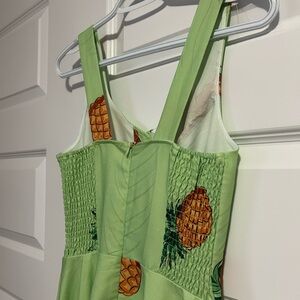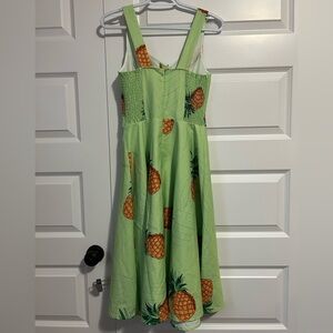 Embrace a tropical meets retro vibe with this delightful dress featuring a playful pineapple print. The sleeveless design and button details add a touch of elegance to the vibrant green fabric.