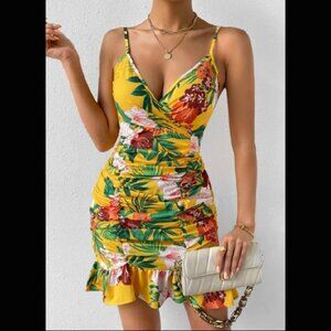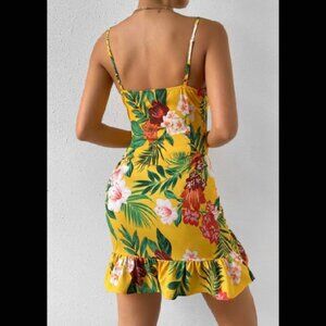 Step out in vibrant style with this stunning Tropical Print Ruffle Hem Cami Dress. This mini-length dress features a sunny yellow base adorned with a bold, colorful tropical floral print. The design boasts a flattering, deep V-neckline with delicate spaghetti straps and a wrap-effect bodice. The body of the dress is expertly ruched to create a figure-hugging, flattering silhouette. Finishing the look is a playful ruffle hem, perfect for adding a flirty bounce to your step. Made for warm weather and tropical getaways, this dress is the ultimate statement piece for summer parties, vacations, or a stylish night out.