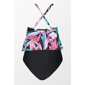 A vibrant tropical print and alluring silhouette take this tankini to the next level. The peplum hem provides flattering coverage in just the right places. The solid black bikini bottom has side shirrings for added dimension and extra charm to the style.