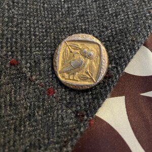 Uniquely designed brown tweed jacket. Interior torso lining is cream and brown leaf motif. Interior lining in sleeves and collar is gold and orange pattern. Golden coloured metal buttons with owl design. Shell: 70% wool, 20% viscose, 5% nylon, 5% acrylic. Lining: 100% acetate. Patches inside include a short story about travel in Switzerland.