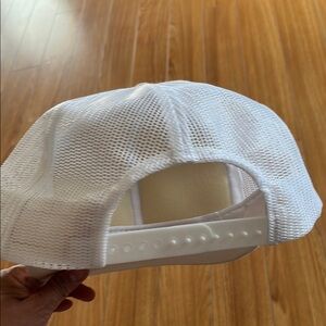 Stylish white cap featuring a red logo on the front. Perfect for casual wear.