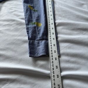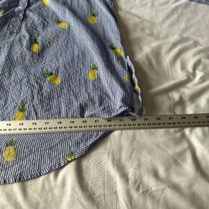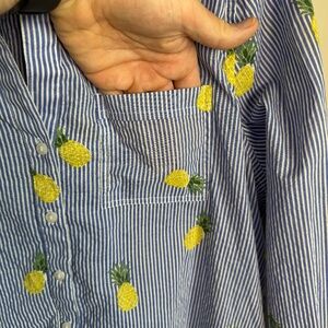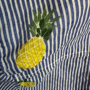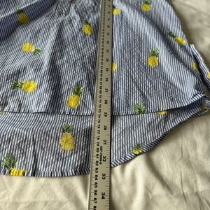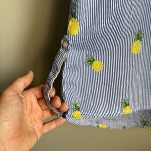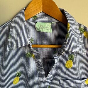 Style tags: beach, vacation, island wear, cover top, bikini cover, pineapples, tropical, pinstripe