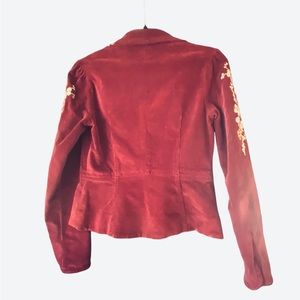 True Meaning jacket size small. Wine coloured corduroy with embroidery on lapel and sleeves. Close up pictures of embroidery shows most accurate colour of jacket.