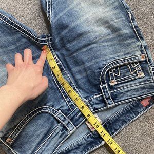 Condition: Excellent pre-owned condition. Denim has minimal wear. The back white brand tag appears a bit darkened/stained likely from dye after washing. It matches the rustic look of these jeans and goes un-noticed when wearing.