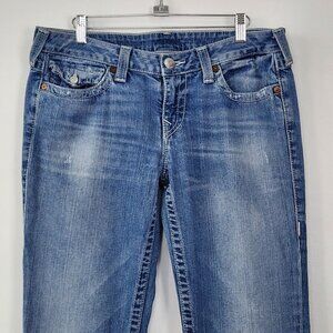womens bootcut jeans, blue denim pants, cotton blend jeans, faded denim jeans, zipper closure jeans, classic denim jeans, casual blue jeans, womens blue pants, bootcut leg jeans, True Religion, Y2K, Billy, 00s, Low Rise, Bootcut, Vintage, Made in USA, Size 32, Light Wash Denim, Straight Leg