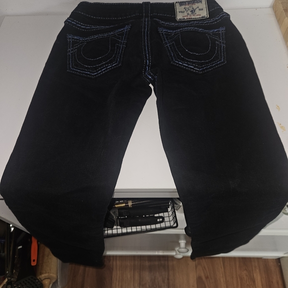 Stylish black jeans with blue stitching details. Iconic True Religion label.
