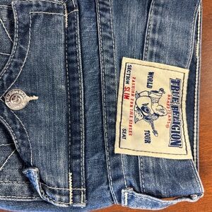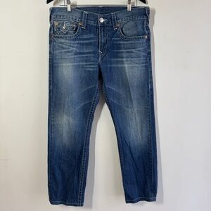 true religion jeans men, designer denim pants, distressed straight leg jeans, men’s size 34 jeans, blue cotton denim, true religion horseshoe stitching, casual streetwear jeans, y2k retro denim style, everyday casual jeans, classic designer jeans, rugged men’s jeans, luxury denim brand, streetwear, gorp, gen z, classic jeans,
