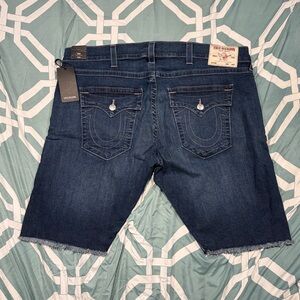 Stylish dark blue jean shorts. Features classic five-pocket design with a Euro hem design. Ideal for casual wear.