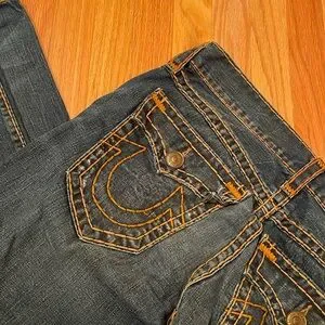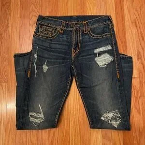 Stylish straight leg jeans. Dark blue with distressed details. Classic True Religion design. 100% cotton. VGC. SFBF pet friendly house. Measurements in pictures.