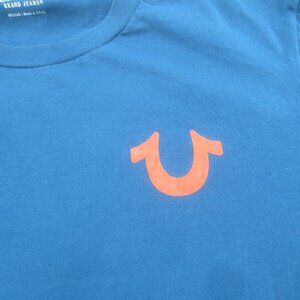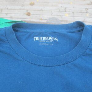 True Religion Jeans Short Sleeved T-Shirt - Size Medium. In excellent to near new condition with no damages. Washed, cleaned, stain and odor free, air and sun dried. This is a men's medium but completely unisex fashion friendly.