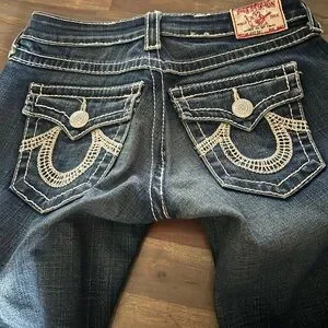 Authentic triple stitch, True Religion®️ Jean, for women. These are as real as they come, purchased from “Pushe”, and had them taken in the waist and length. The size now is marked below: if you compare the stitching in photos, you can see they were hemmed and taken in, but a beautiful pair of jeans still- just don’t fit me well anymore.