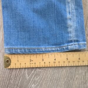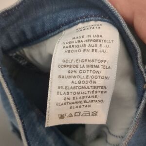 This item is pre-owned in good condition with 2 small flaws. There is a faint stain and also a fabric defect both in the front. Please see photos. Still great looking jeans.