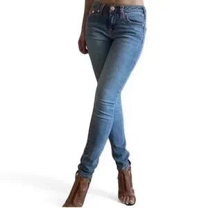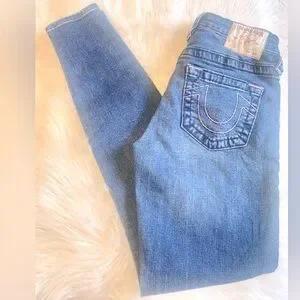True Religion mid rise super skinny Jennie Curvy style dark wash blue jeans with light pink contrast stitching. Look amazing with some UGGS!