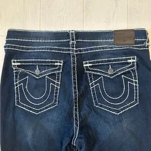 Stylish and comfortable dark blue jeans perfect for any occasion. True Religion signature stitching and horseshoes on back pockets.