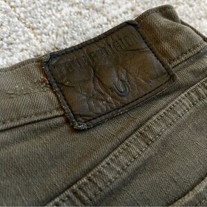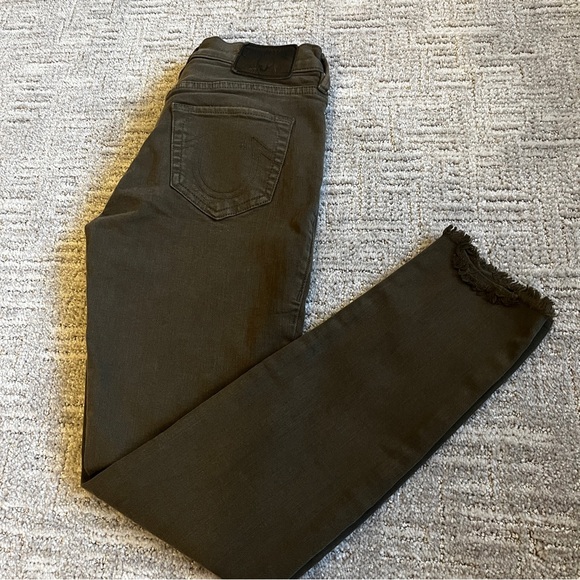 Stylish skinny jeans by True Religion. Features a dark olive color. Perfect for casual wear.