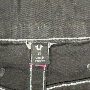 True Religion NWOT Ricky Flap SN 105712 Men's Size 35x33 Thick Pink Stitching in fair pre owned condition as shown in the photos with some staining and a tear in the crotch area that will need repairing.