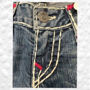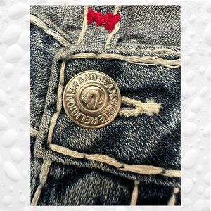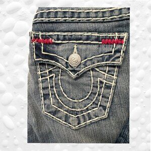 Snag these iconic True Religion skinny jeans, perfect for adding a touch of flair to your wardrobe. Made in the USA, these jeans feature thick white stitching with pink accent stitching, making them a standout piece in excellent condition.
